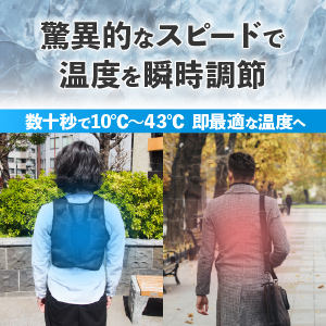 操作簡単、60秒で10℃に冷却 ワンプッシュで屋内屋外あらゆる環境で体感温度を下げることが可能です。 60秒で10℃に到達し背中の脊髄動脈を冷やし、身体の内側から体感温度を下げます。