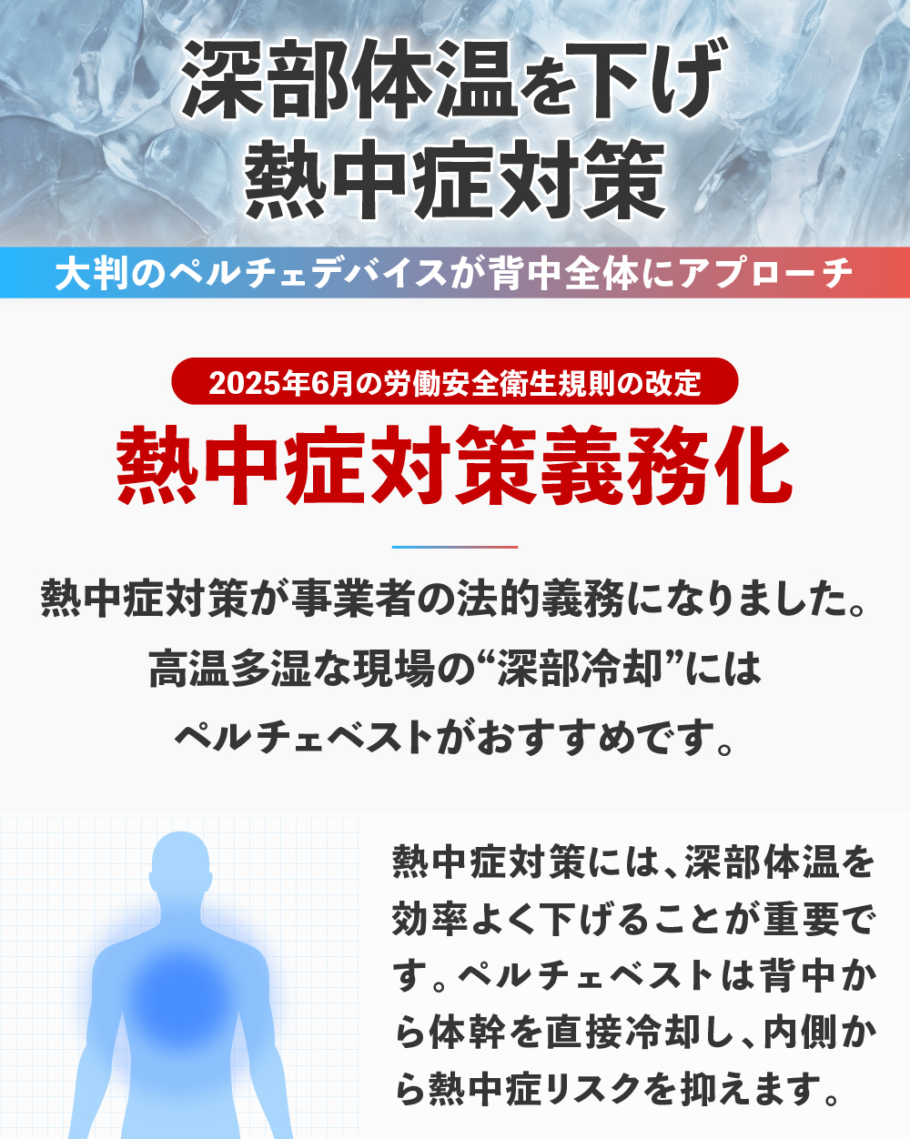 最先端技術のペルチェ素子で体内を循環する血液を直接冷やし、身体の内側から体感温度を下げます。