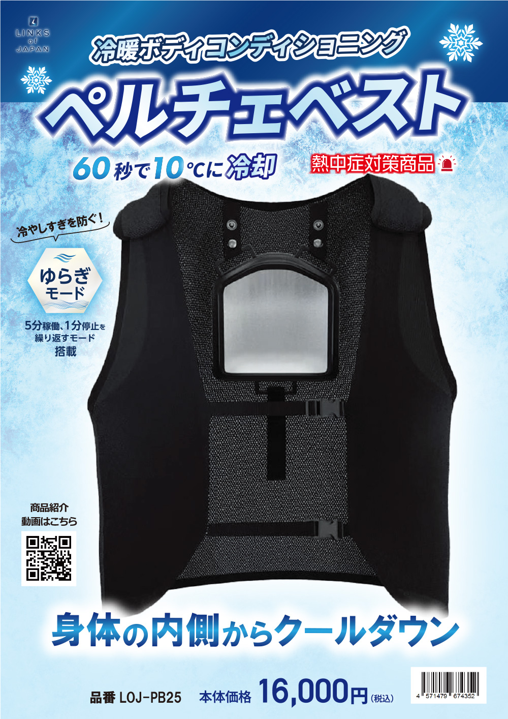 操作簡単、60秒で10℃に冷却 ワンプッシュで屋内屋外あらゆる環境で体感温度を下げることが可能です。 60秒で10℃に到達し背中の脊髄動脈を冷やし、身体の内側から体感温度を下げます。