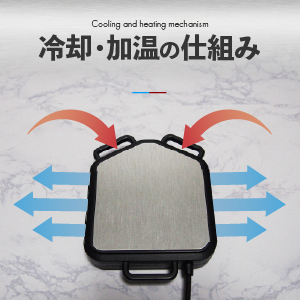 ペルチェ素子とは、ペルチェ効果を用いた板状の半導体熱電素子の一種で、医療用冷蔵庫やワインセラー、 CPU冷却装置など電子冷熱に多く使われている最先端技術です。 ある方向に直流電流を流すと、素子の上面で吸熱(冷却)し、下面で発熱(加熱)します。 直流電流の向きを変えると冷却面と加熱面が入れ替わる為、商品仕様によっては冷却機能と温熱機能 双方の機 能を使い分ける事が出来ます。 ペルチェ素子を用いた冷却装置は体積が小さく、騒音や振動を発生しないという特長をもち、ツーリング時を はじめ、あらゆる場面でご使用が可能です。