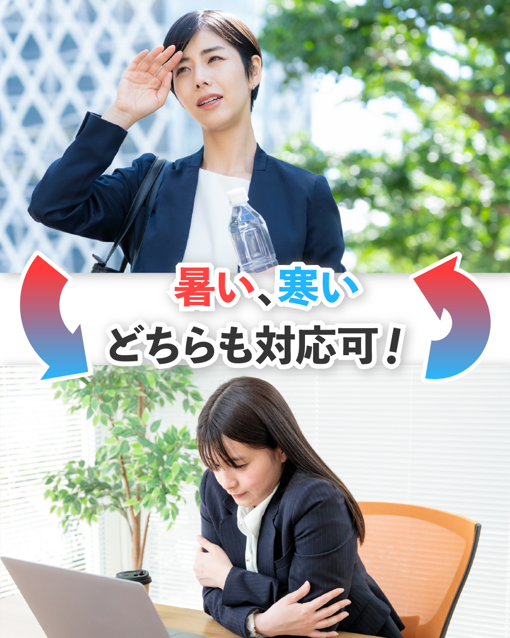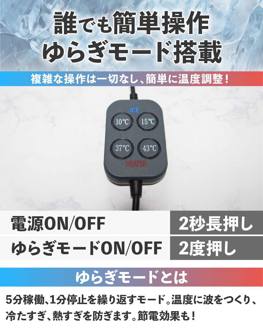 冷却、温熱切り替え式で使用可能 夏は冷却[10℃]、冬は温熱[43℃]としてオールシーズンご使用頂けます。