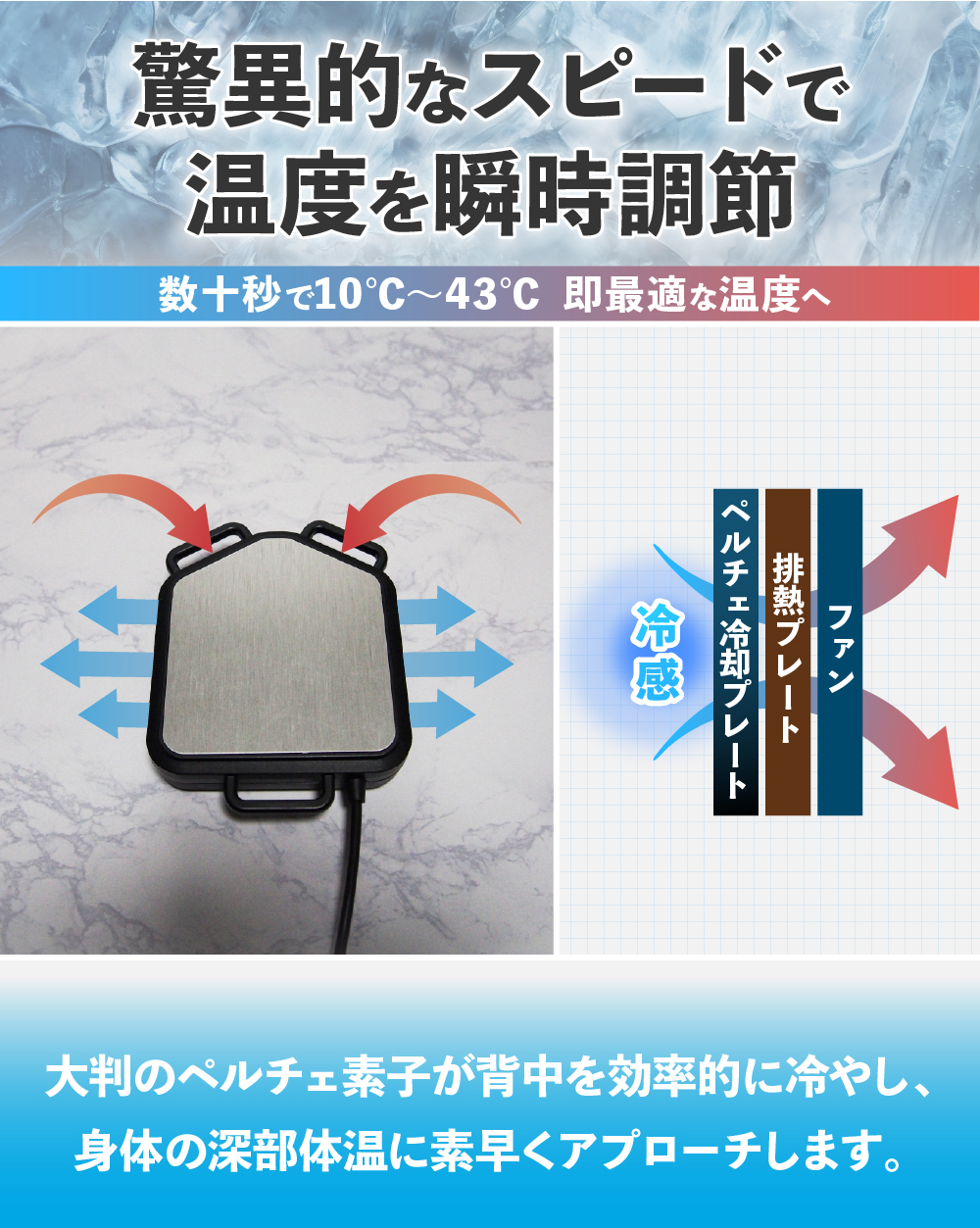 最先端技術のペルチェ素子で体内を循環する血液を直接冷やし、身体の内側から体感温度を下げます。