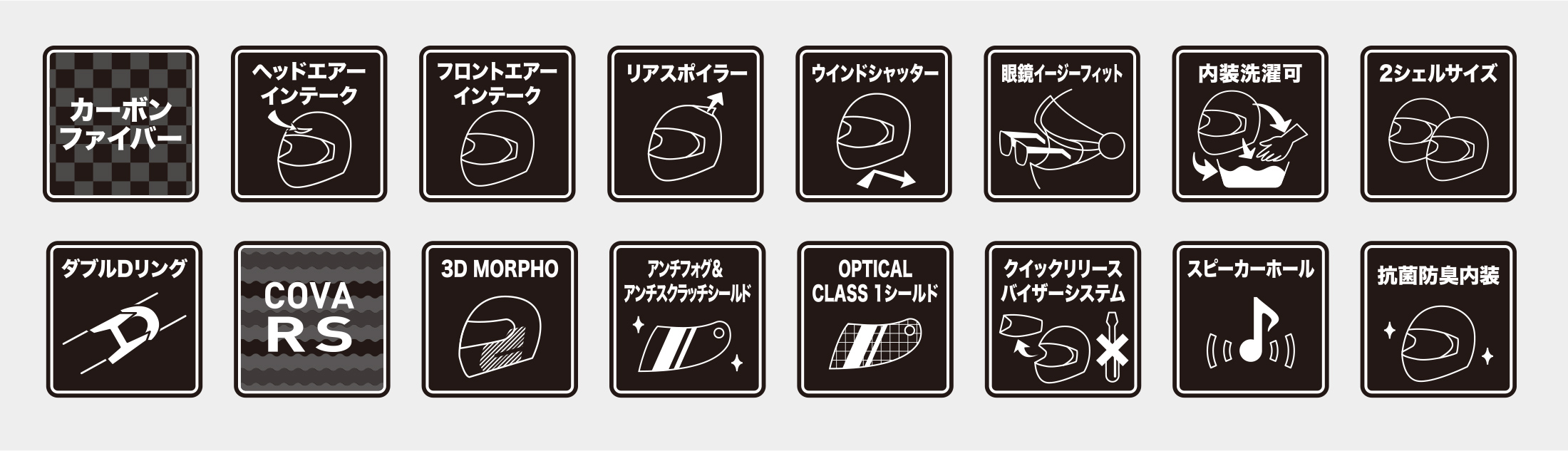 - COVA RS(外側は固く軽いカーボン、内側にはしなやかで強く軽いアラミド繊維の複合構造シェル) + 発泡倍率を部分最適化させたEPSインナーライナー。